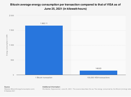 Additionally, bitcoin transactions consume a lot more energy compared to standard Visa transactions. In fact, one single Bitcoin transaction in 2021 is estimated to equal several hundreds of thousands of VISA card transactions.