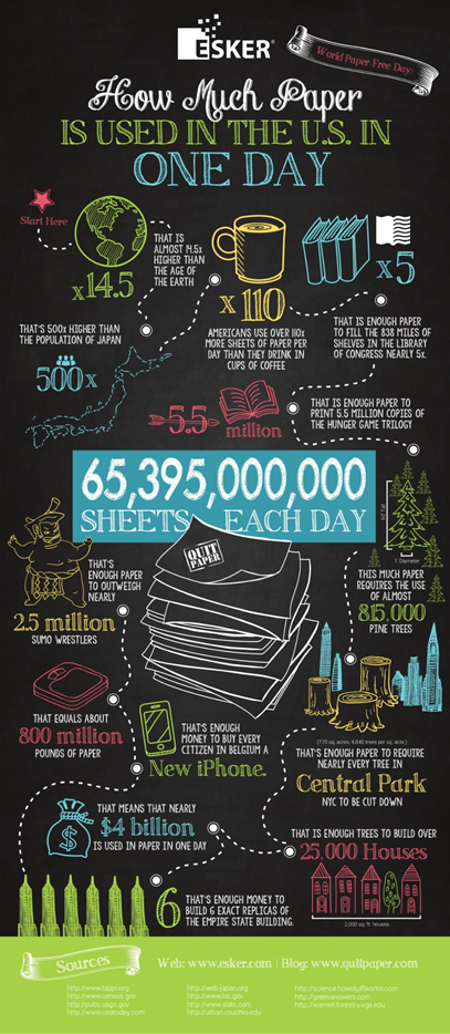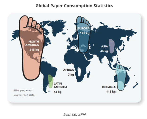This information provides a foundation to analyze the macro-level impact of typical business consumption. The world produces 300 tons of paper every year. This requires upwards of 15 billion trees to be cut down annually.