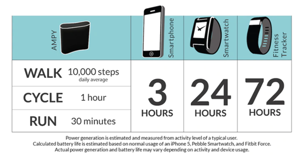 There is also SolePower, work boot producers that use kinetic energy to fuel low-power sensors, such as GPS. Let’s not forget about AMPY, a wearable/carriable pack that reaches full charge with 10,000 steps a day, or a cycling workout. This pack can then charge up your phone, smartwatch, or fitness tracker with a simple USB plugin.