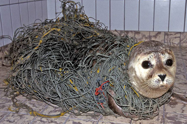 More than ten million tons of litter enter the oceans annually, causing the death of many marine animals. Many of animals think that plastic and other dangerous substances are food. It costs them their lives. We also have an example where a seal was on the net, but it was found by chance and rescued by humans.