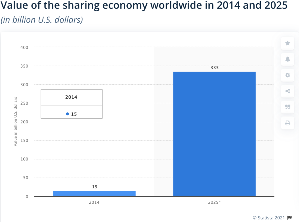 In 2014, the value of the sharing economy was around 15 billion U.S. dollars according to Statista, whereas the forecasted value in 2025 is 335 billion U.S. dollars. The huge increase in value showcases the relevance of the shared economy
